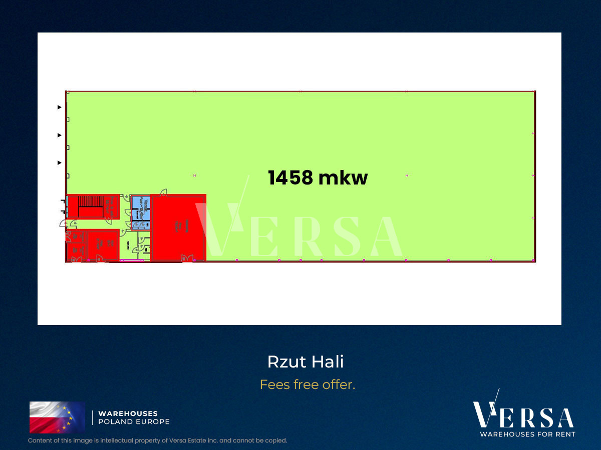 Specifications and equipment: Warehouse area: 1,458 sq m. Warehouse height: 9 m net. Number of doors: two docks, one "0" door. Floor load capacity: 5T/sq m. Fire resistance: 4,000 MJ/sq m. Column grid 15 x 12 m. Office space available for rent up to 400 sq m, minimum 200 sq m. Warehouse rent: €4.10/sq m. Office rent: €11/sq m. The service charge rate is PLN 10.30/sq m. Warehouse available immediately.