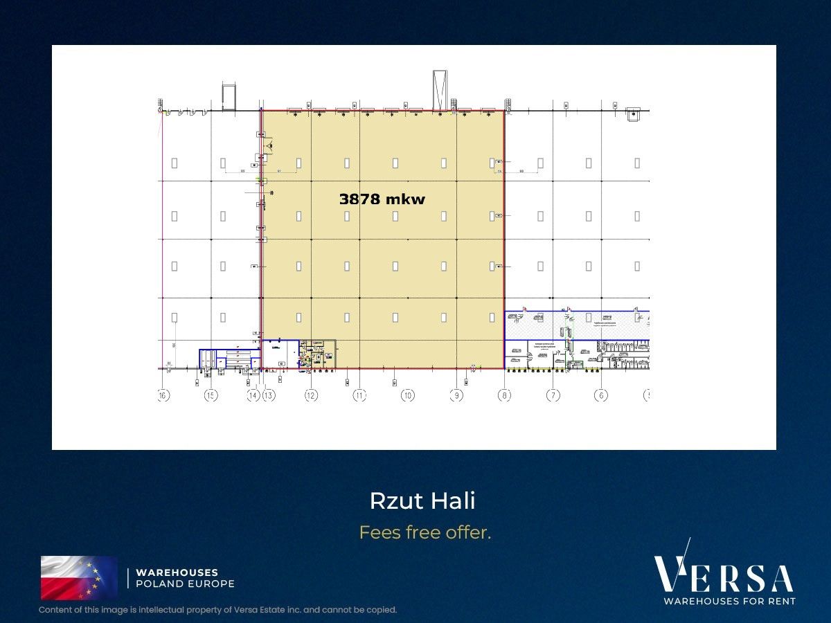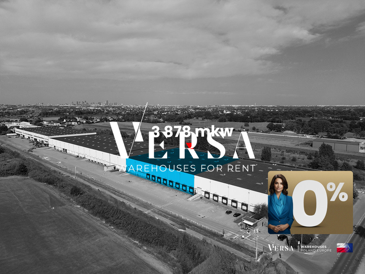 Specifications and equipment: Warehouse area: 3 878 sq m. Warehouse height: 9 m net. Number of doors: 9 docks, one "0" door. Floor load capacity: 4T/sq m. Fire resistance: 2,000 MJ/sq m. Column grid 15 x 12 m. Office space available for rent up to 400 sq m. Warehouse rent: €3,34/sq m. Office rent: €9/sq m. The service charge rate is PLN 11.05/sq m. Warehouse available immediately.