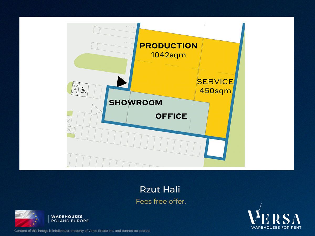 Stawka bazowa czynszu najmu za magazyn 8 EUR/mkw, za biuro 13,5 EUR/mkw. Hala dostępna 1Q/2026. Dodatkowo płatne: opłata serwisowa 8,95 zł/mkw oraz opłaty związane z zużyciem mediów.