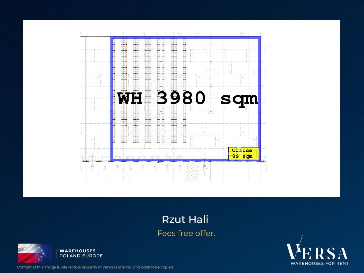 Warehouse with office and staff facilities available for rent in a new facility. The 3,980 sq m warehouse plus office and social space of 89 sq m, is equipped with 6 docks and 1 ground-level access gate. Dust-free flooring with a load capacity of 5T/sq m, 10 m hall height, 22.5 x 12 column grid, no common areas within the buildings, full parking lot management, and 24-hour security. Chargers for EV Effective rent for the hall is EUR 3.20/sq m with a 3-year contract. Office rent is EUR 12.00/sq m, service charge PLN 10.00/sq m.. The warehouse is located in a warehouse and office complex, also suitable for light manufacturing. Available from 05/2026.