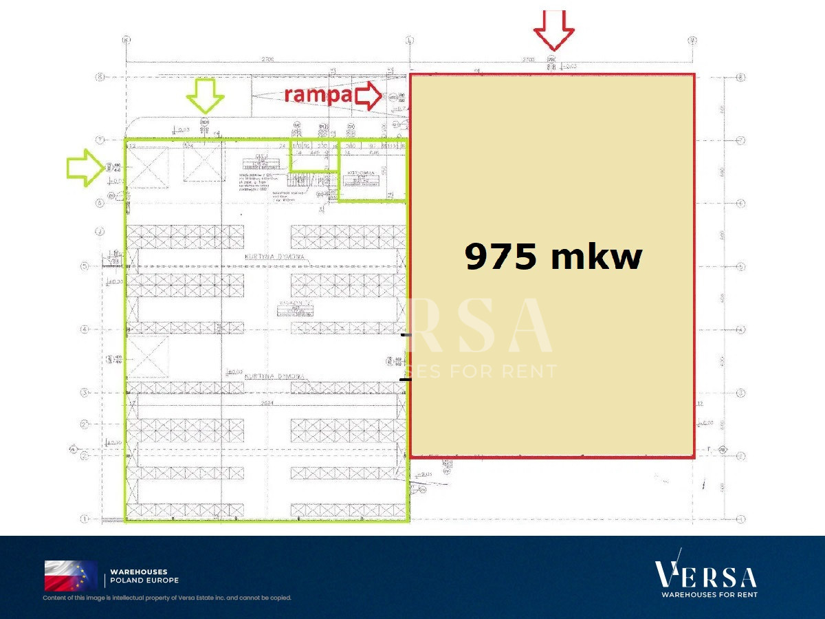 Warehouse for rent. For rent a warehouse hall with an area of 975 sq m including an office and social area. Protected and monitored area with an anti-burglary system. Open area without columns, with a storage height of 9 m, dust-free floor with a load capacity of 5t/sq m. Access to the warehouse through one entrance gate from level "0" with a height of 4.50 m and through the dock. Electrically opened gates. Maneuvering area in front of the hall. Rent rate per square meter of warehouse space PLN 41. Additionally payable: media according to meter readings and security. Parking spaces along the hall free of charge. Physically protected and monitored area with an anti-burglary system.