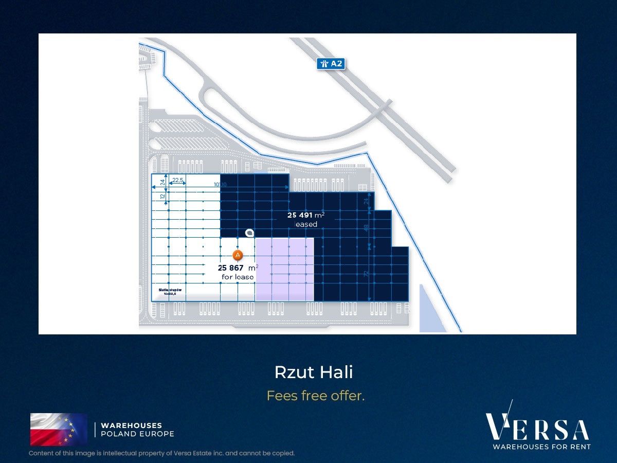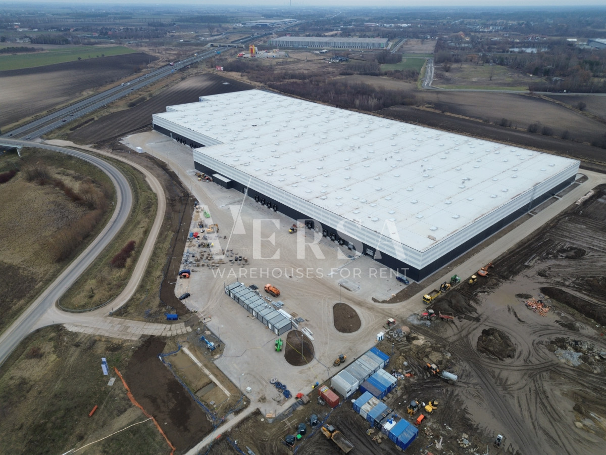 Technical parameters and equipment: Access to the warehouse through docks and one gate 0, Storage height 12 m, floor load capacity 8T/sq m, dust-free floor, column grid 12 x 22.5 m, fire resistance 4000 MJ/sq m, LED lighting, sprinklers, 24-hour security, monitoring, spacious maneuvering areas,
