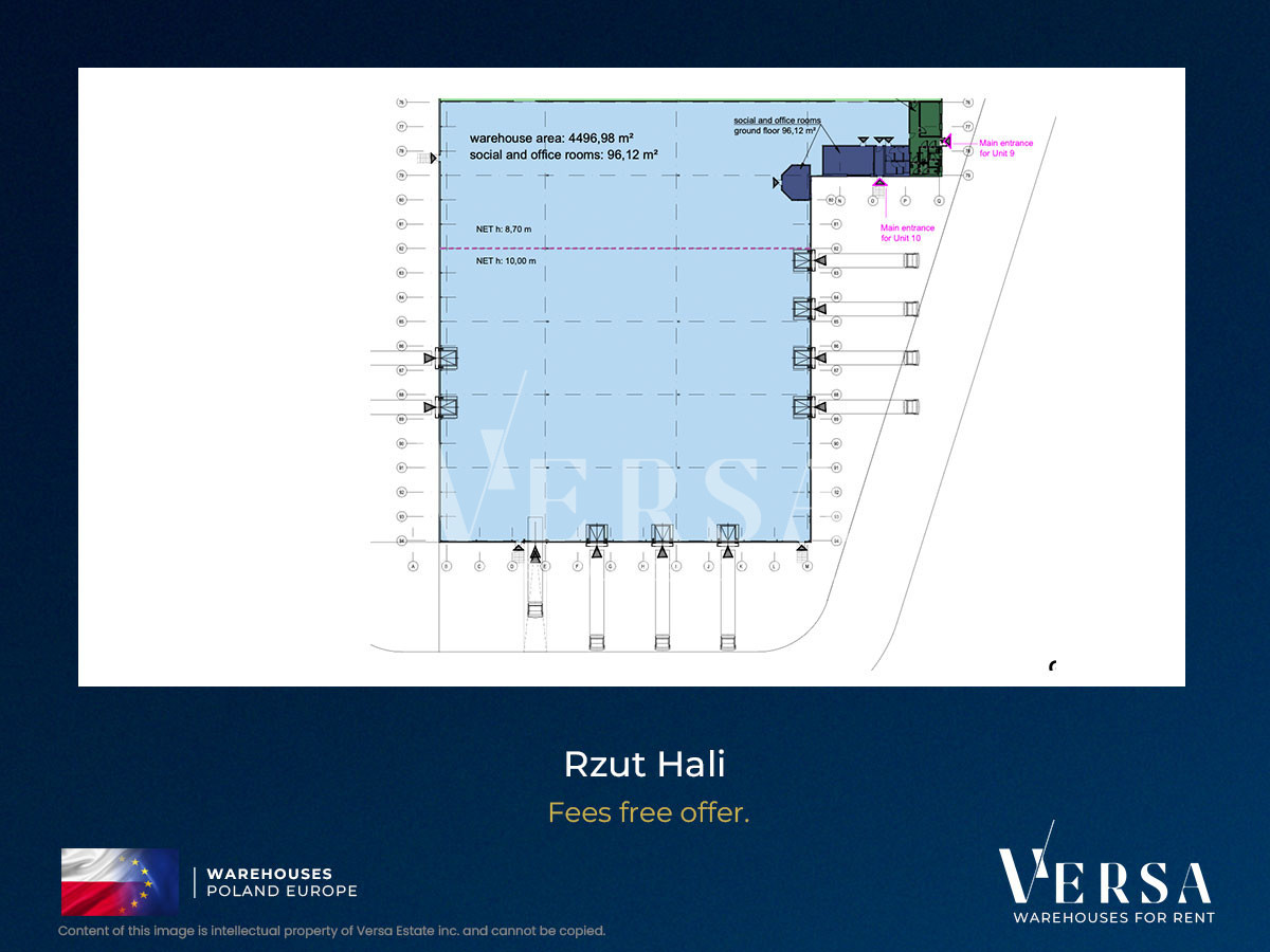 For rent a 3969 sq m warehouse hall plus 66 sq m office/social area, located in a modern business, technology and logistics park, offering high-quality office and warehouse space in Piaseczno. The facility is located 15 km south of the center of Warsaw, 7 km from Okęcie airport and near access to the A2 motorway and the Warsaw bypass.