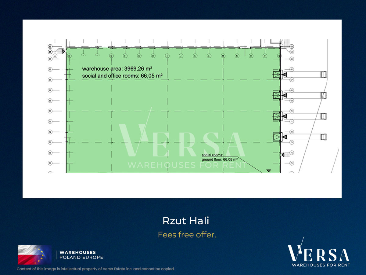 For rent a 3969 sq m warehouse hall plus 66 sq m office/social area, located in a modern business, technology and logistics park, offering high-quality office and warehouse space in Piaseczno. The facility is located 15 km south of the center of Warsaw, 7 km from Okęcie airport and near access to the A2 motorway and the Warsaw bypass.