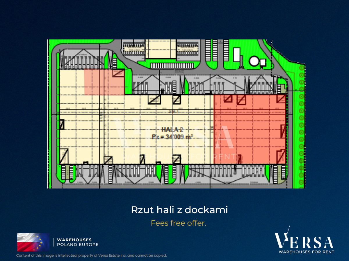 For rent a warehouse with an office/social area of 1589 sqm, near the A2 motorway junction. Warehouse 1589 sq m, office 90 sq m. Hall parameters: storage height 10 m, dust-free floor with a load capacity of 5 T / sq m, full fire protection, 4 docks with protective collars and hydraulic lifts, one 0 gate, LED lighting, daylight through skylights. Service fee: 2,1 Euro. Additional fees: electricity, heating, internet, water / sewage - counters usage. Hall available immediately.