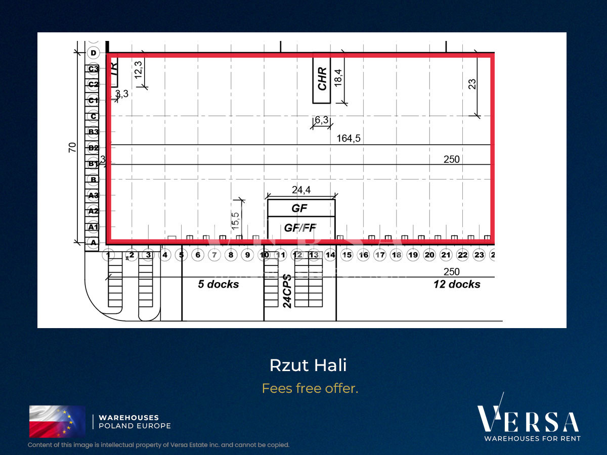 Technical parameters and equipment: height to the bottom of the steel structure 8,3 m; Column grid from 12x23 to 12.5x25; 6 docks with hydraulic ramps, 2 gates 0, fire resistance 4000 MJ/sq m;