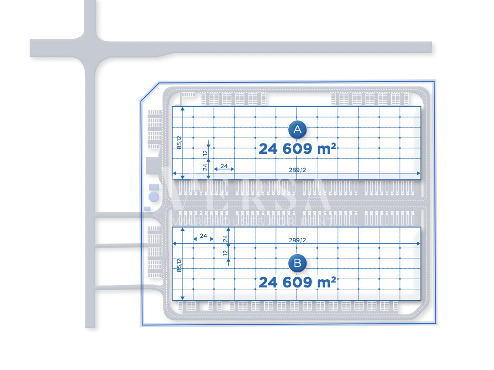 PROPERTY DESCRIPTION: The warehouse area is 2,035 sq m. Floor load capacity is 6 tons/sq m, column grid is 12 x 24 m, and net height is 8.5 m. The facility is equipped with an ESFR sprinkler system, smoke vents, LED lighting, and skylights, as well as 24-hour monitoring. The property includes 30-meter-wide maneuvering areas and parking spaces for cars and trucks. The rental rate for the warehouse is EUR 6.3/m2, for the office EUR 13/m2, service fee PLN 11.00/m2, the cost of a parking space EUR 30/m2. This warehouse facility is located 8 km from the center of Warsaw in the Targówek district. The park is adjacent to the Toruńska Route (S8 expressway), providing convenient access to the A2 motorway.