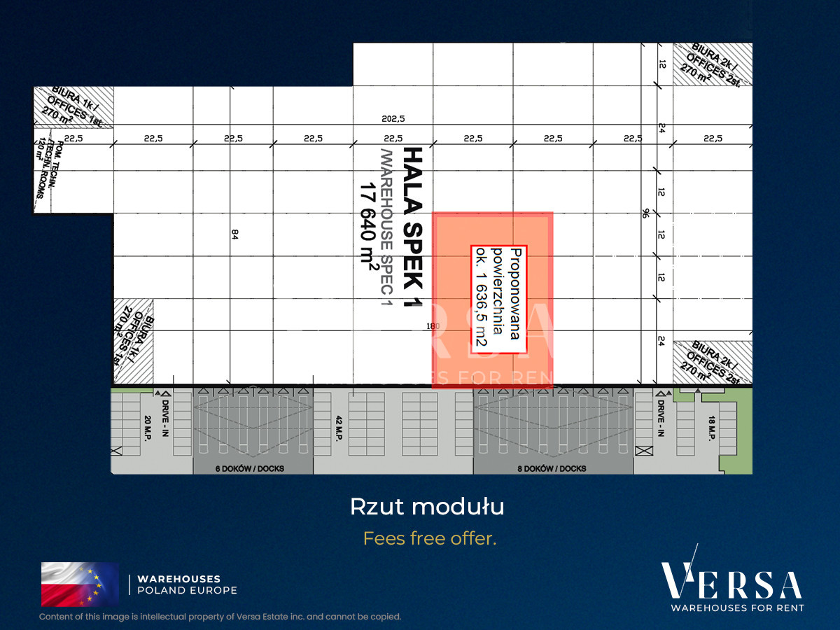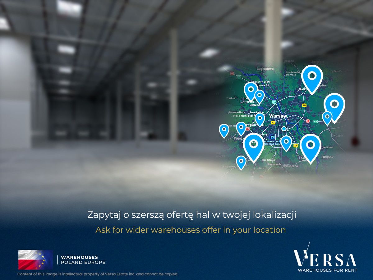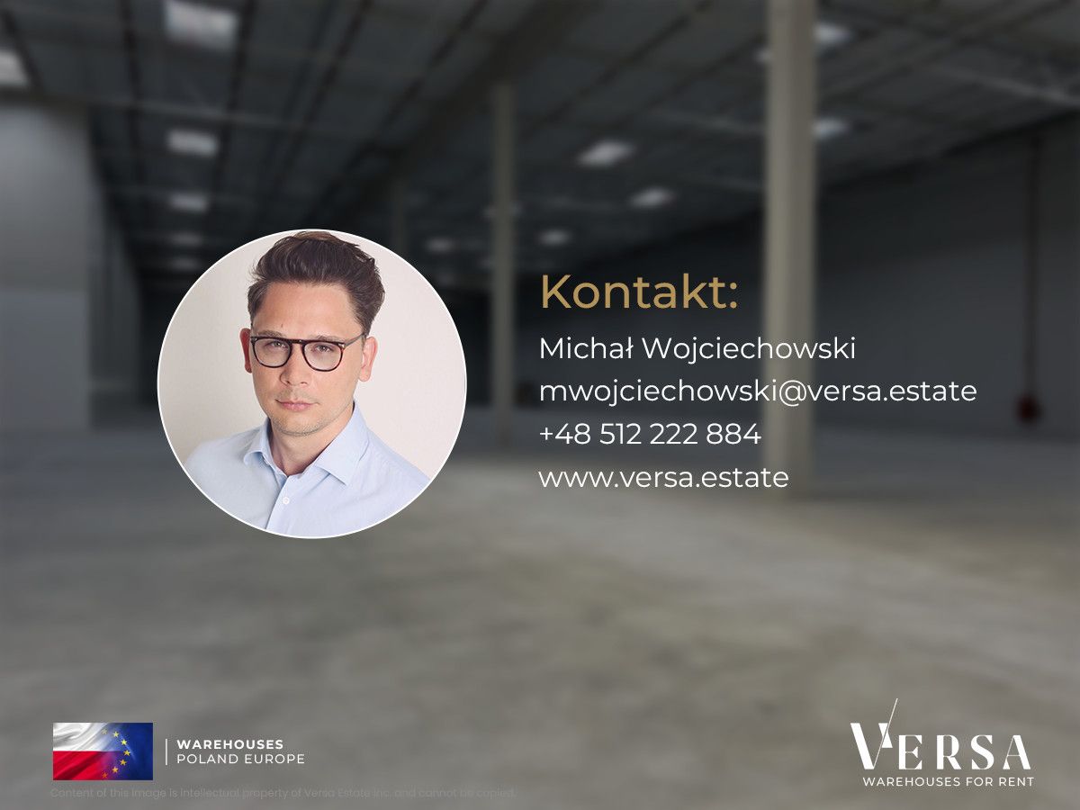 For rent a warehouse hall with an area of 1636,5 sqm. The hall is equipped with docks and a gate 0. Hall parameters: storage height 10 m, column grid 12x22.5, dust-free floor with a load capacity of 5 T / sq m, ESFR sprinkler system and smoke flaps, docks with protective collars and hydraulic lifts, LED lighting, daylighting through skylights. Possibility of building office and social space inside the hall. Office rent 13.25 EUR / sq m, operating fee 5,68 PLN / sq m. Hall available immediately.