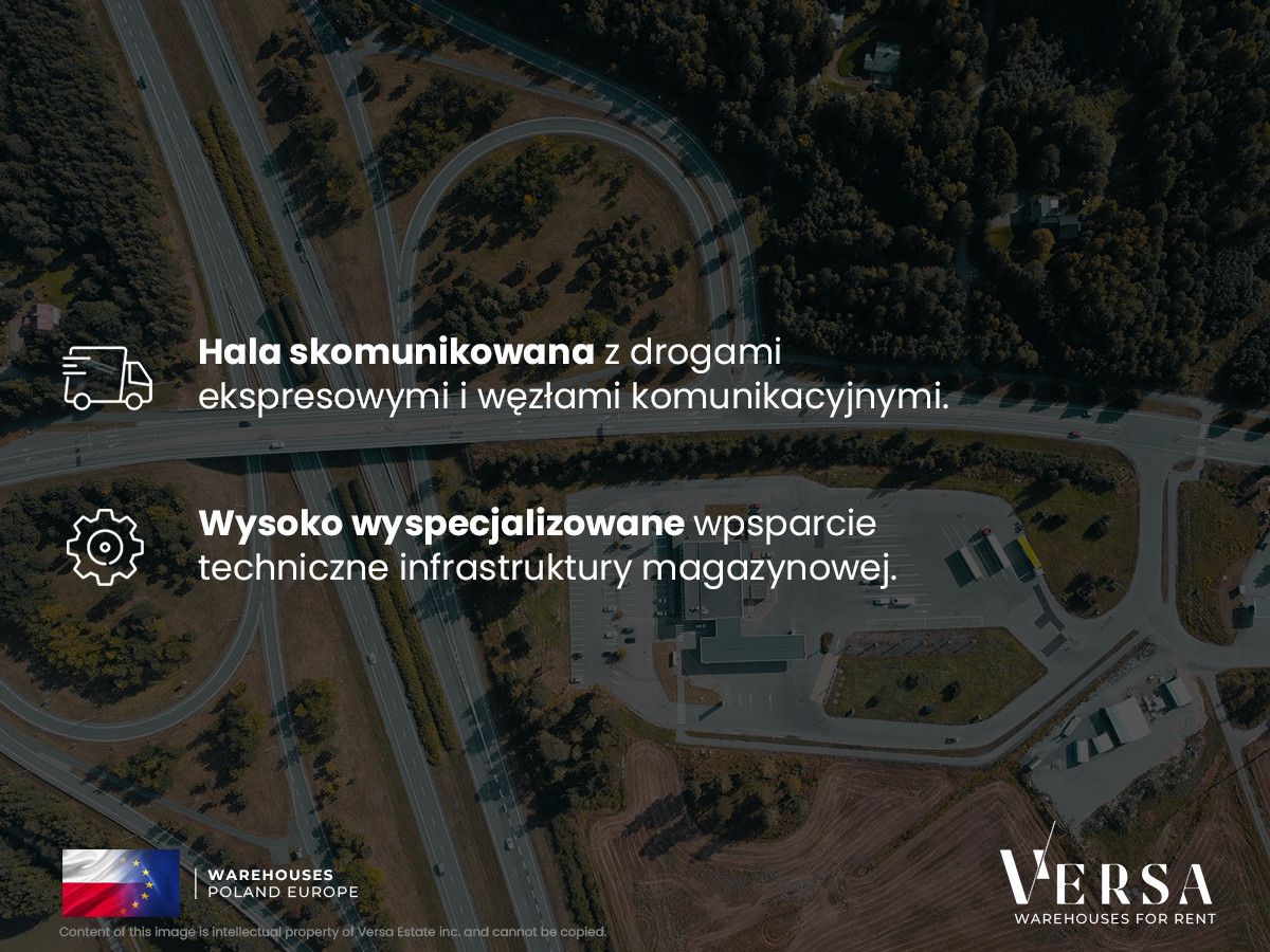 Do wynajęcia hala magazynowa o powierzchni 1632,5 mkw. Hala wyposażona w doki i bramę 0. Parametry hali: wysokość składowania 10m, siatka słupów 12x22,5, posadzka bezpyłowa o nośności 5T/mkw., system zraszaczy ESFR i klapy dymowe, doki z ochronnymi kołnierzami i hydraulicznymi podnośnikami, oświetlenie typu LED, doświetlenie światłem dziennym przez świetliki. Możliwość wybudowania powierzchni biurowo-socjalnej wewnątrzy hali. Czynsz za biuro 13,25 EUR/mkw, opłata eksploatacyjna 5,68 zł/mkw. Hala dostępna od zaraz.