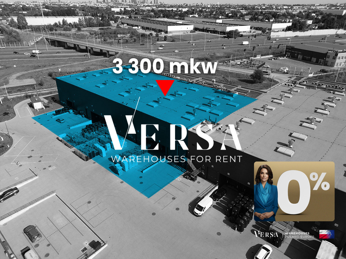 A modern, Class A warehouse for rent, with an area of 3300 sq m plus a 660 sq m office, located in Okęcie.