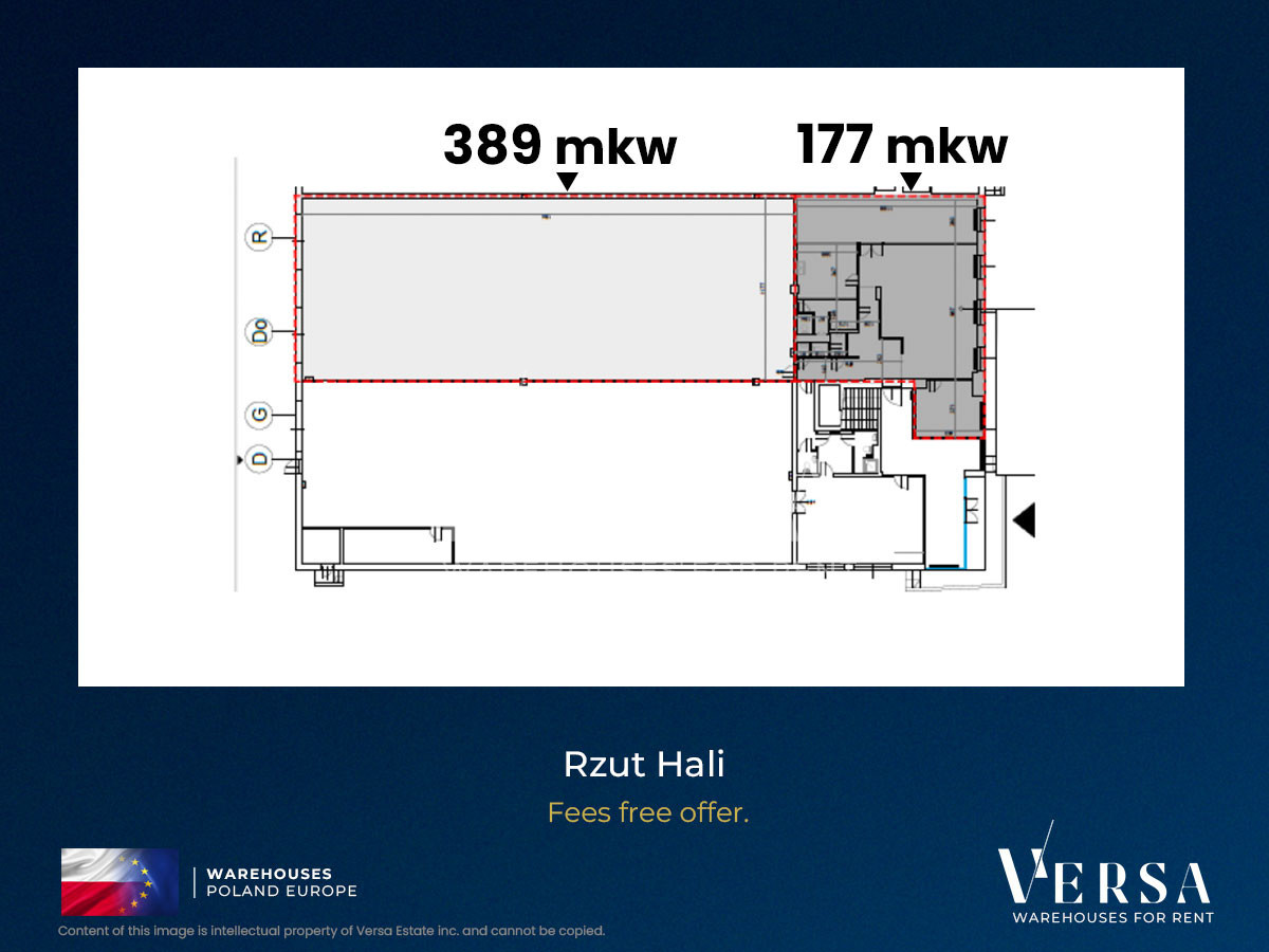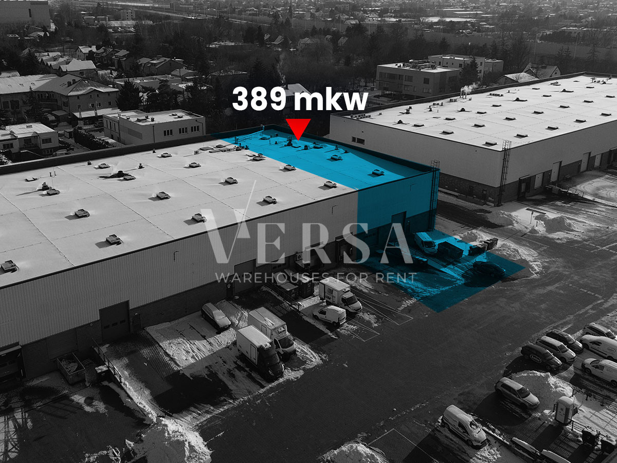 A 389 sq m warehouse and 177 sq m of office space, totaling 659 sq m, are available for rent in a modern logistics park in Warsaw's Okęcie district.