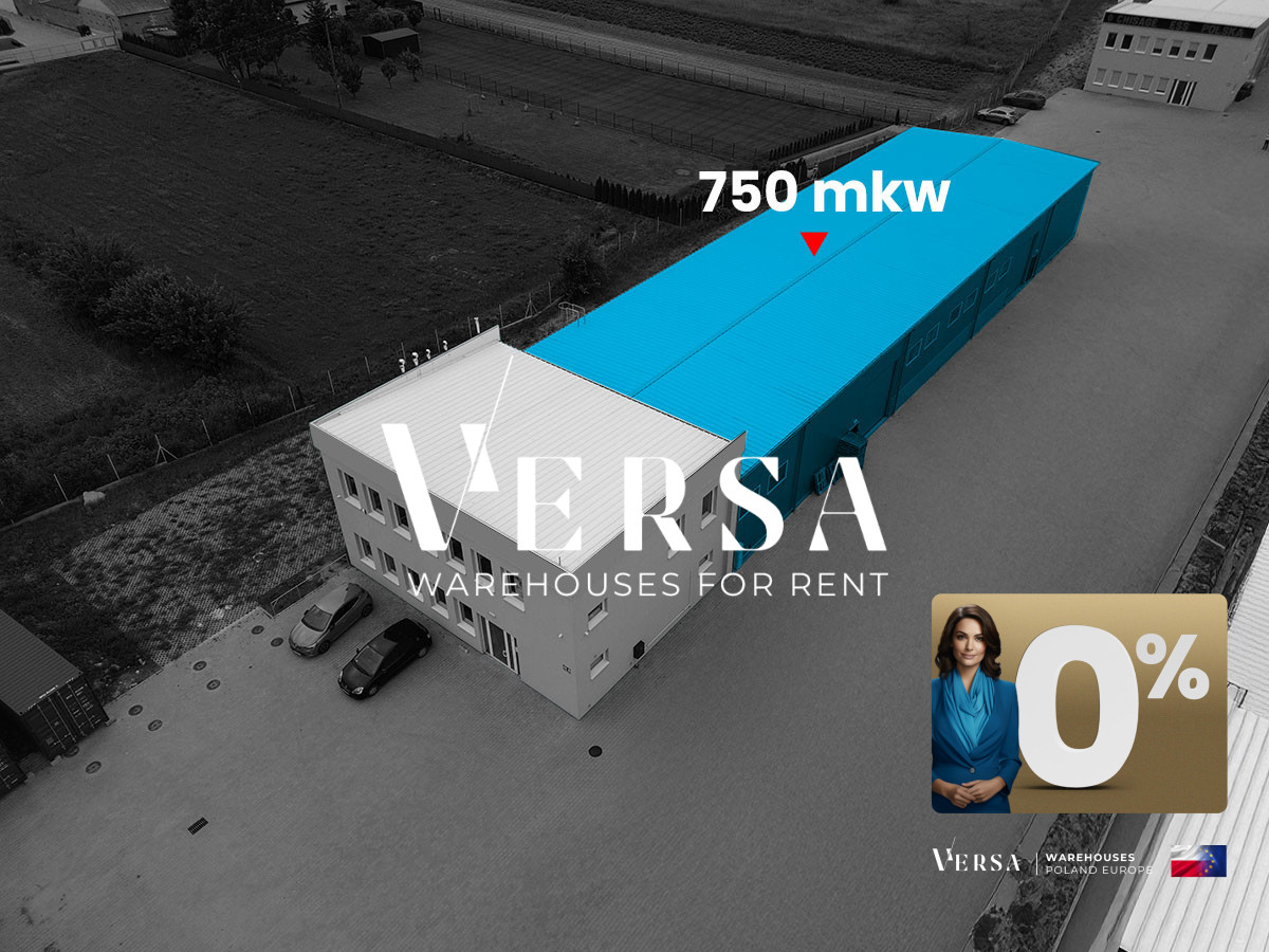 Parameters and equipment: Warehouse area 750 m2, Office area 270 m2 (two floors), Two gates from level 0, Hall height 6 m, Heated office, Warehouse unheated, Media: electricity, water, sewage, telecommunications, Dust-free floor, Fenced, monitored, paved area with maneuvering areas, Parking lots for passenger cars and delivery vans. Rent PLN 33,000 net plus meter fees.