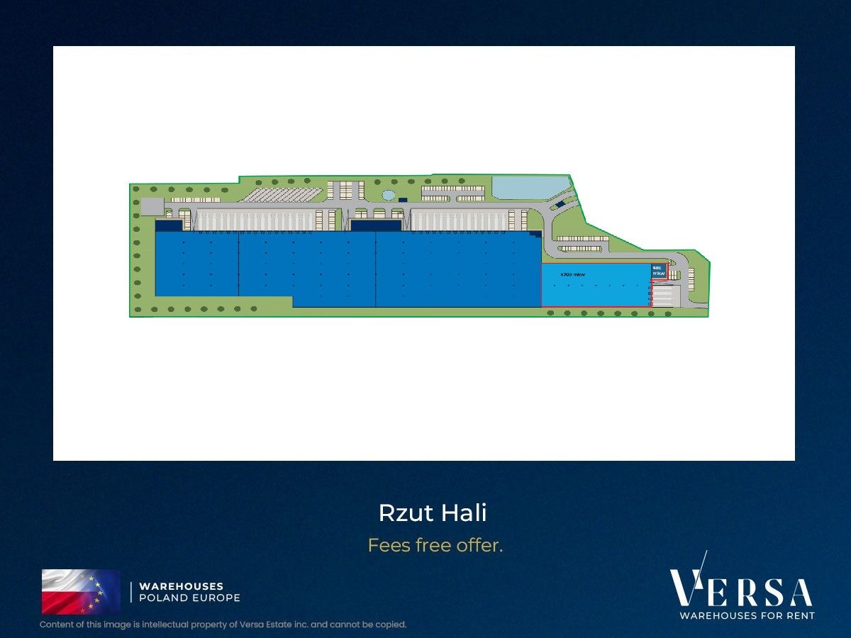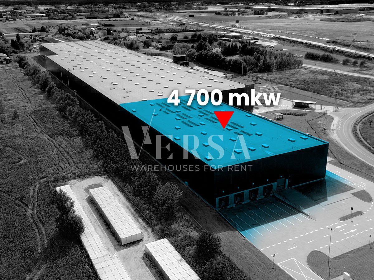 Czynsz najmu magazyn 4,80 EUR/mkw, biuro 12,85 EUR/mkw, opłata eksploatacyjna 7,20 zł/mkw. Hala dostępna od marca 2026 r.
