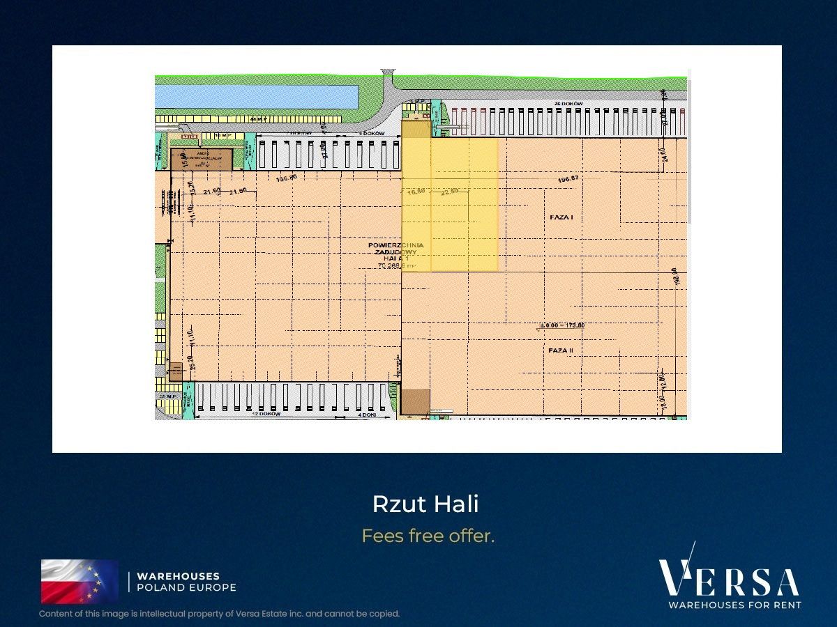 Warehouse with office and staff facilities available for rent in a new facility. The 5600 sq m warehouse. Office/staff space - negotiable. Gates: 5 docks, 1 ground-level gate.is equipped with 5 docks and 1 ground-level access gate. Dust-free flooring with a load capacity of 5T/sq m, 10 m hall height, 22.5 x 12 column grid, no common areas within the buildings, full parking lot management, and 24-hour security. Chargers for EV Effective rent for the hall is EUR 2.90/sq m with a 5-year contract. Office rent is EUR 12.00/sq m, service charge PLN 10.00/sq m.. The warehouse is located in a warehouse and office complex, also suitable for light manufacturing. Available from 05/2026.