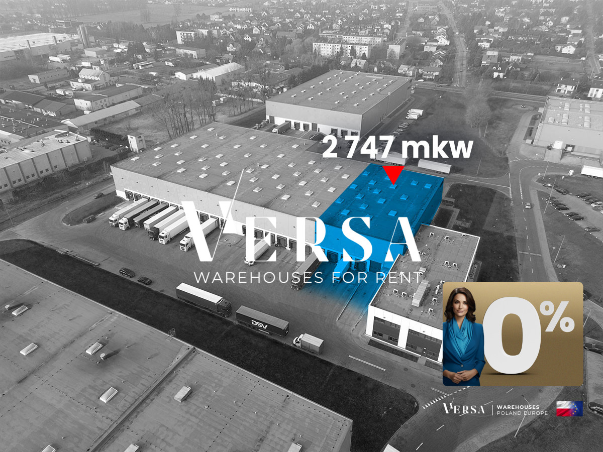 Warehouse with office and staff facilities available for rent in a new facility. The 2,747 sqm warehouse is equipped with 4 docks and 2 ground-level access gates. The warehouse includes a 200 sqm office/staff unit. Dust-free flooring with a load capacity of 5T/sq m, 10 m hall height, 22.5 x 12 column grid, no common areas within the buildings, full parking lot management, and 24-hour security. The warehouse rent is 4.95 PLN. The office rent is 12.00 PLN/sq m, and the service fee is 7.70 PLN/sq m. The warehouse is located in a warehouse and office complex, also suitable for light manufacturing. Available from Q3'26.